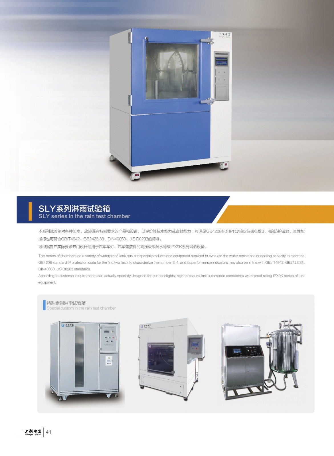 本系列淋雨试验箱对各种防水、防渗漏有特别要求的产品和设备,以评价其抗水能力或密封能力,其中此台淋雨试验箱可满足GB4208标准IP代码第6位表征数7的防护试验,其性能指标也可满足GB/T4942、GB2423.38、DIN40050的标准。具有试验空间大、模拟环境的特点。